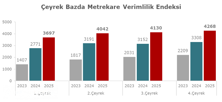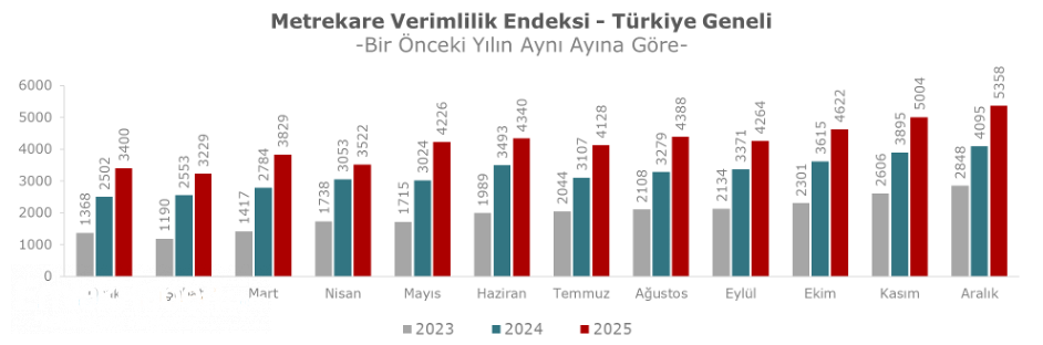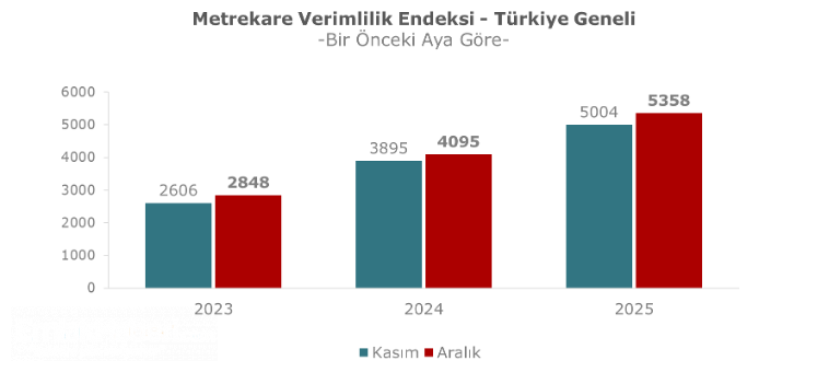 Aralık 2025 döneminde metrekare verimlilik endeksi, Kasım 2025 dönemi ile karşılaştırıldığında ve enflasyondan arındırılmadan incelendiğinde yüzde 7,1 oranında yükseliş göstererek 5358 puana yükselmiştir.