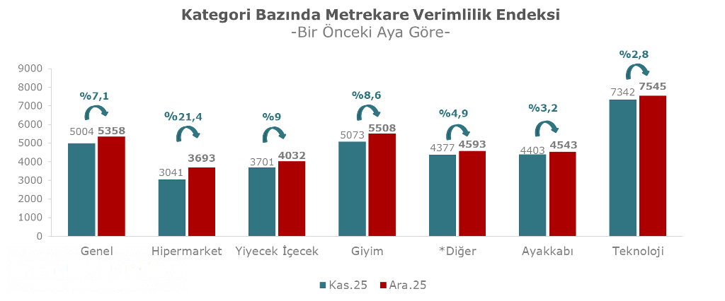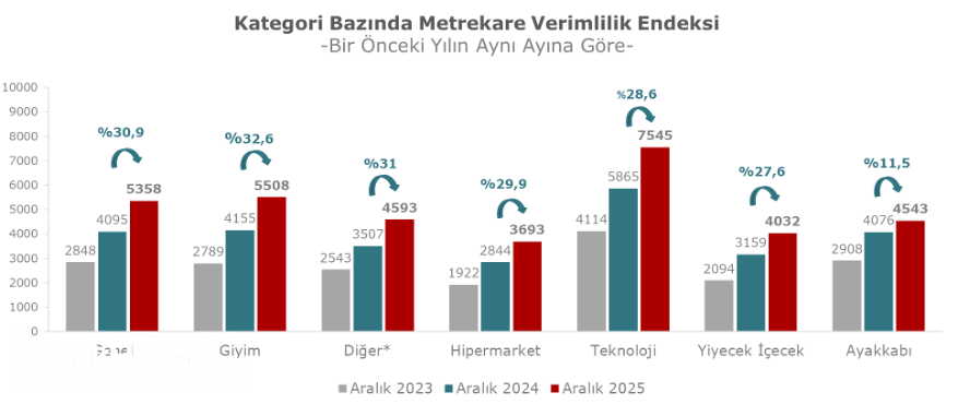 Aralık 2025 döneminde kategoriler bazında metrekare verimlilik endeksi, Kasım 2025 dönemi ile karşılaştırıldığında ve enflasyondan arındırılmadan incelendiğinde; hipermarket kategorisinde yüzde 21,4, yiyecek içecek kategorisinde yüzde 9, giyim kategorisinde yüzde 8,6, diğer kategorisinde yüzde 4,9, ayakkabı kategorisinde yüzde 3,2 ve teknoloji kategorisinde yüzde 2,8’lik artış yaşandığı görülmektedir.