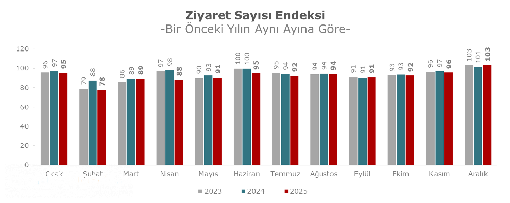 Aralık 2025 verileri bir önceki yılın aynı ayı ile karşılaştırıldığında ziyaret sayısı endeksinde yüzde 2 oranında artış olduğu gözlemlendi.
