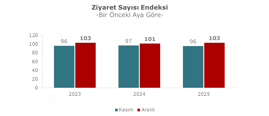 Aralık 2025 döneminde ziyaret sayısı endeksi bir önceki ay Kasım 2025 ile karşılaştırıldığında yüzde 7 oranında bir artış olduğu gözlemlendi.