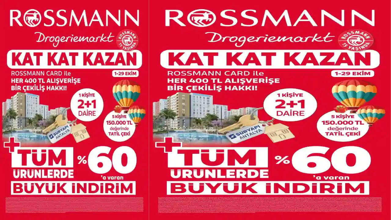 Türkiye’deki 15’inci yılını kutlayan Rossmann’ın, 1–29 Ekim 2025 tarihleri arasında geçerli olacak “Kat Kat Kazan” çekiliş kampanyası kapsamında; tüm ürünlerde %60’a varan indirimler uygulanacak. Ayrıca Rossmann Kart sahiplerine Rossmann mağazaları ile online satış platformlarında yapacakları her 400 TL’lik alışveriş harcamasına 1 adet çekiliş hakkı verilecek.