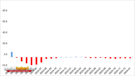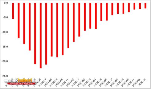 Türkiye genelinde satılık konutların reel fiyatların yıllık değişim oranında 2024 yılının başından bu yana azalmaya devam ediyor. 2026 Ocak’ta yıllık fiyat değişimi oranı geçen aya kıyasla 0,2 puan artsa da yüzde -1,9 ile negatif bölgede kalmayı sürdürdü.
