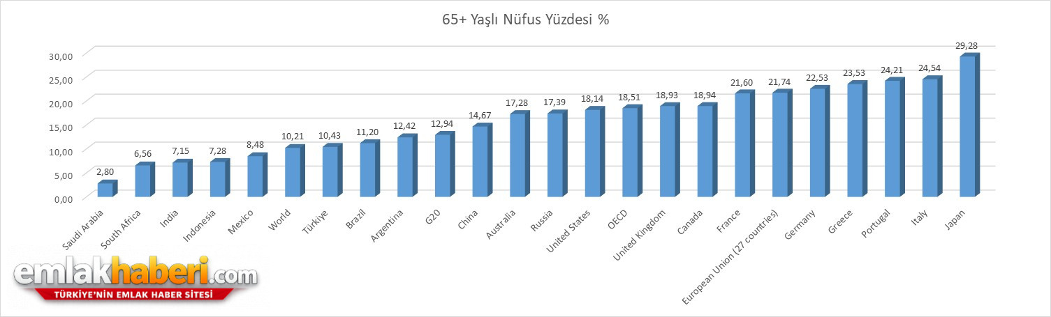 OECD’nin 2024 yılı G20 verilerine göre; Dünyada en yüksek yaşlı nüfus oranı %29 ile Japonya’da, Avrupa’da %24 ile İtalya ilk sırada yer alıyor. 2024 itibarıyla Türkiye’de 65 yaş üstü nüfus oranı %10,64 seviyesinde bulunurken, 2050 projeksiyonlarına göre bu oranın %23’e yükselmesi ve bugünkü Almanya ile Yunanistan seviyelerine yaklaşması öngörülüyor.
