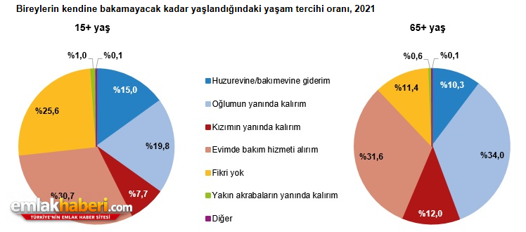 TÜİK’in 2021 Türkiye Aile Yapısı Araştırması, yaşlı bakımına ilişkin tercihlerde önemli ipuçları sunuyor; 15 yaş üzeri bireylerin %27,5’i, 65 yaş üzerindekilerin ise %46’sı yaşlandığında çocuklarının yanında kalmak istiyor. Evde bakım hizmeti talebi 15 yaş üzerindekilerde %30,7, 65 yaş üzerindekilerde %31,6. Huzurevini tercih edenlerin oranı ise yaş arttıkça düşüyor. Araştırma, zaman içinde çocuk yanında kalma talebinin azalabileceğini; evde bakım ve bakım merkezlerine yönelimin artabileceğini gösteriyor.